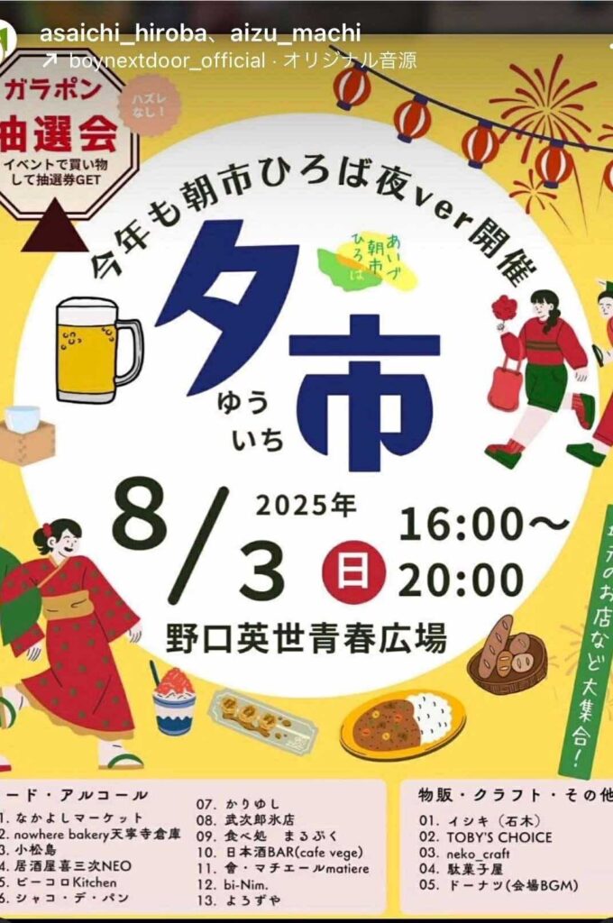 同日出店 14:30~搬入し、野口英世青春ひろば夕市 16:00~20:00まで