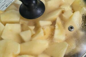 ① フライパンに 『りんご』 を1kg100% 大きめザク切りにし、中火でりんごそのままで水分を飛ばします。
