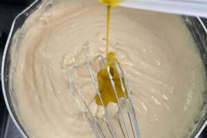 会津平飼い全卵とカルシウムを多くを含む沖縄県産赤糖(本和香糖)をすり合わせます。